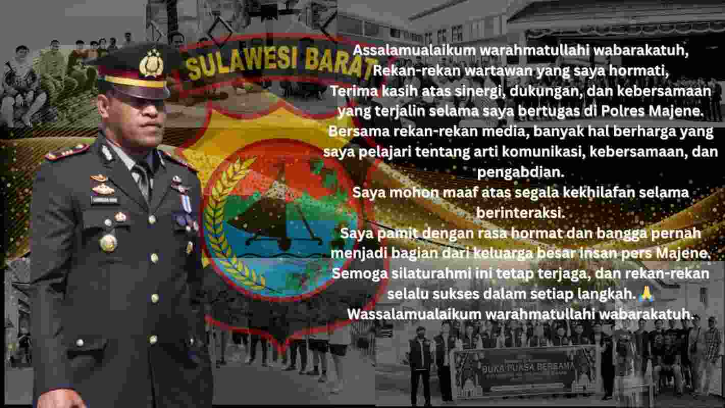 SWARAMANDAR.COM, MAJENE — Suasana haru menyelimuti momen perpisahan Kasat Reskrim Polres Majene, AKP Laurensius Madya Wayne, S.T.K., S.I.K., dengan para insan pers di Kabupaten Majene. Melalui pesan yang disampaikan di grup WhatsApp Humas Polres Majene, perwira menengah yang dikenal ramah dan bersahaja itu menyampaikan salam perpisahan sekaligus ungkapan terima kasih mendalam atas sinergi yang terjalin selama masa tugasnya.