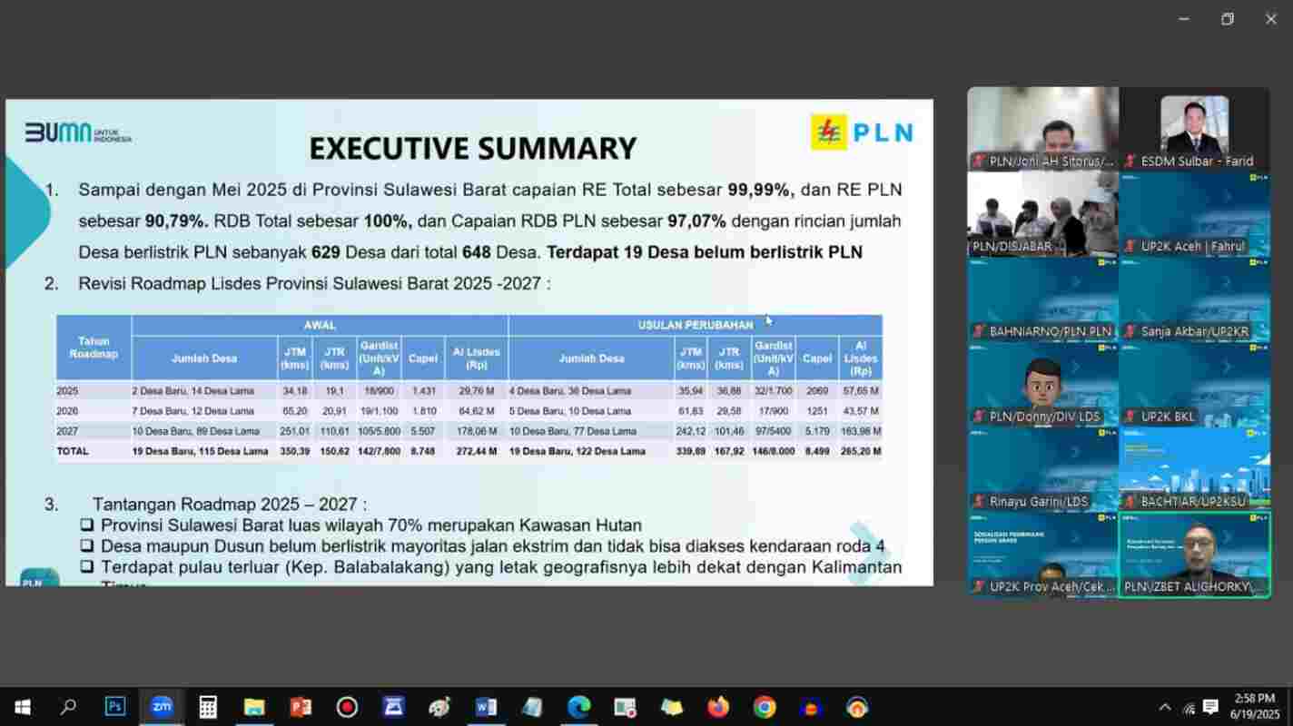 Dalam rapat tersebut, Manager UP2K PT PLN Sulbar, Izbet Alighorky, turut menyampaikan capaian dan tantangan pembangunan listrik desa di Sulbar. Hingga Mei 2025, Rasio Elektrifikasi total mencapai 99,99% dan Rasio Desa Berlistrik (RDB) mencapai 100%. Namun, masih terdapat 19 desa yang belum dilistriki oleh PLN.