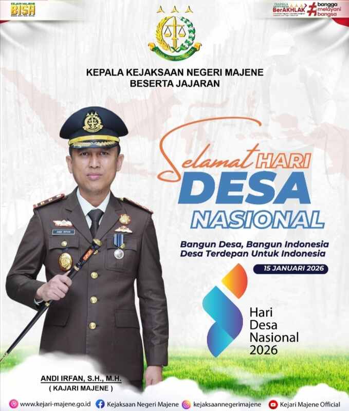 SWARAMANDAR.COM, MAJENE — Peringatan Hari Desa Nasional yang jatuh pada 15 Januari 2026 menjadi momentum penting bagi institusi hukum untuk memperkuat sinergi dengan pemerintahan desa. Kepala Kejaksaan Negeri (Kajari) Majene, Andi Irfan, S.H., M.H., secara resmi menyampaikan ucapan selamat sekaligus menegaskan komitmen jajarannya dalam mengawal pembangunan desa yang transparan dan akuntabel.