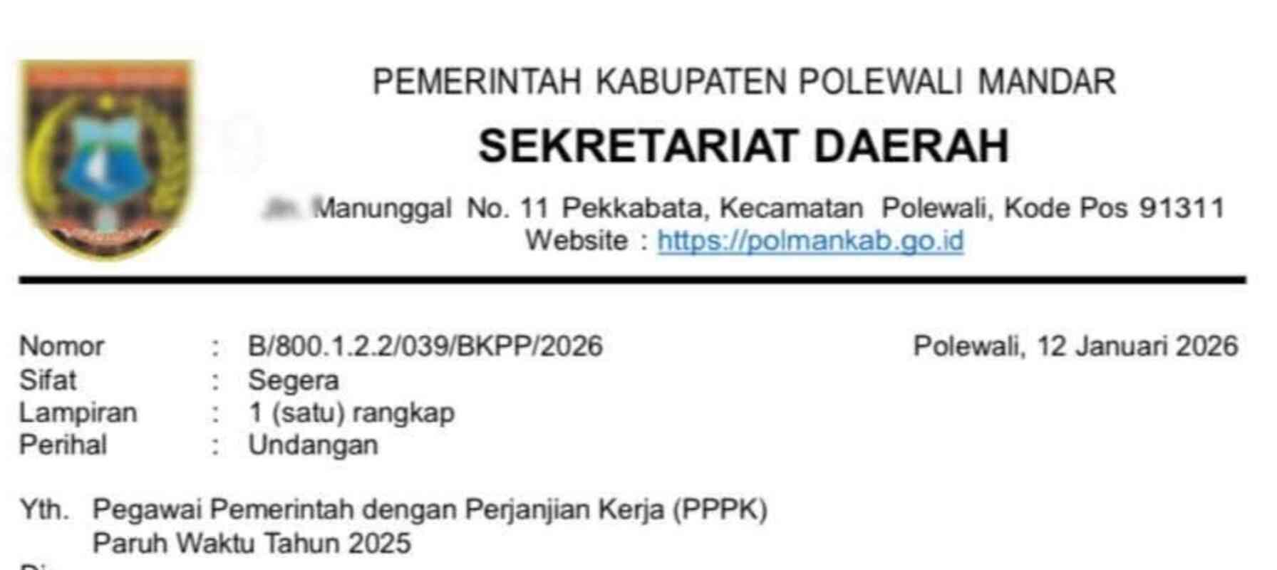 Momen bersejarah ini dipastikan melalui surat resmi Sekretariat Daerah Kabupaten Polman bernomor B/800.1.2.2/039/BKPP/2026. Penyerahan SK yang ditandatangani oleh Sekretaris Daerah Polman, Nursaid, S.Sos., MM, ini akan dipusatkan di Halaman Kantor Bupati Polewali Mandar.