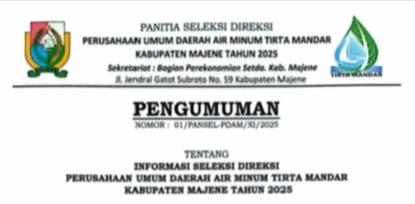 SWARAMANDAR.COM, MAJENE, Jumat.28/11/25.Pemerintah Kabupaten Majene resmi membuka seleksi calon Direksi Perusahaan Umum Daerah (Perumda) Air Minum Tirta Mandar untuk periode 2026–2030. Pengumuman yang diterbitkan Panitia Seleksi pada 27 November 2025 ini menandai dimulainya rangkaian rekrutmen terbuka bagi para profesional yang memenuhi kualifikasi untuk memimpin perusahaan daerah strategis tersebut.