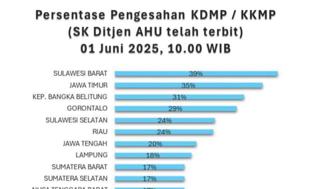SWARAMANDAR.COM, MAMUJU – Direktorat Jenderal Administrasi Hukum umum (Ditjen AHU) Merilis data terkini sekira pukul 10.00 WIB, Minggu, 1 Juni 2025. Persentase pengesahan Koperasi Desa Kelurahan Merah Putih (KDMP) dan Koperasi Kelurahan Merah Putih (KKMP) menempatkan Provinsi Sulawesi Barat di peringkat pertama capaian pembentukan dan pengesahan Koperasi Desa Kelurahan Merah Putih.